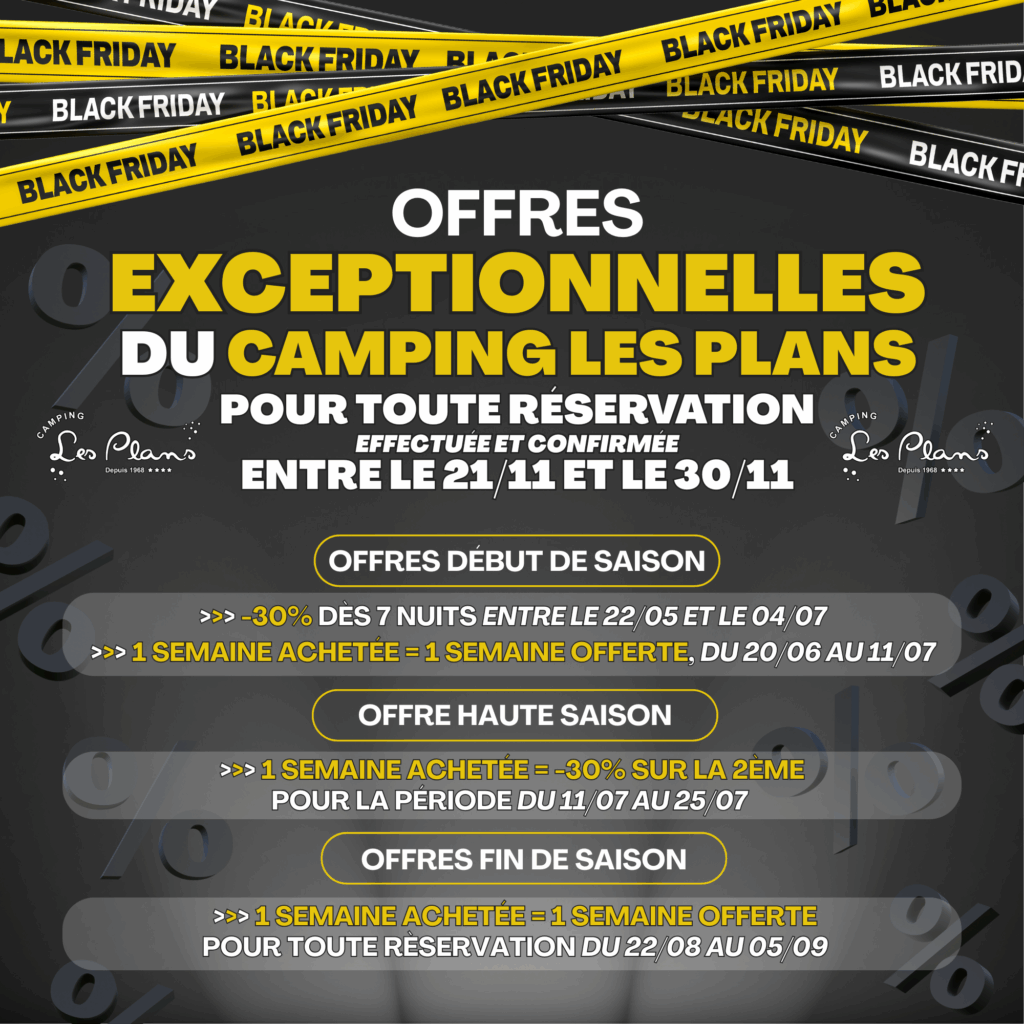 Les offres seront uniquement disponibles et visibles sur notre site internet www.camping-les-plans.fr du 21/11/2025 au 30/11/2025